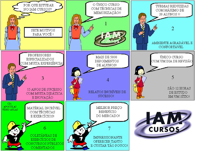 O Único Curso com Técnicas de Memorização preparatório para concursos Públicos. A proposta do IAM CURSOS é realmente incrível. Não propomos revisar as matérias necessárias a aprovação do candidato e sim ensiná-las. Utilizando um método Único e uma Didática avançada e motivadora. Nesses dezessete anos temos aprovado candidatos com uma rapidez surpreendente. Este é o Curso que fará a diferença em sua vida.
